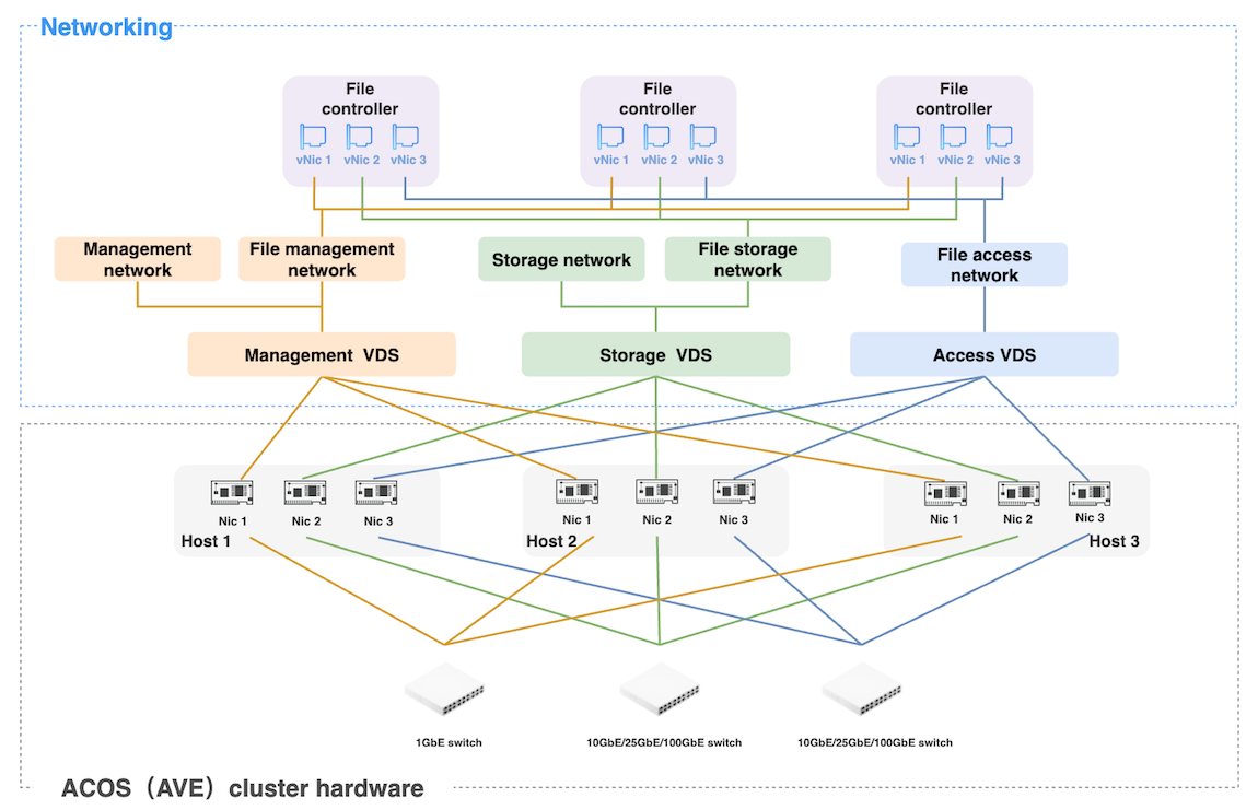 | File management network | 1 Gbps and above. | Connected to the management network of the ACOS (AVE) cluster. | Associated with at least one network interface on each host of the ACOS (AVE) cluster. |