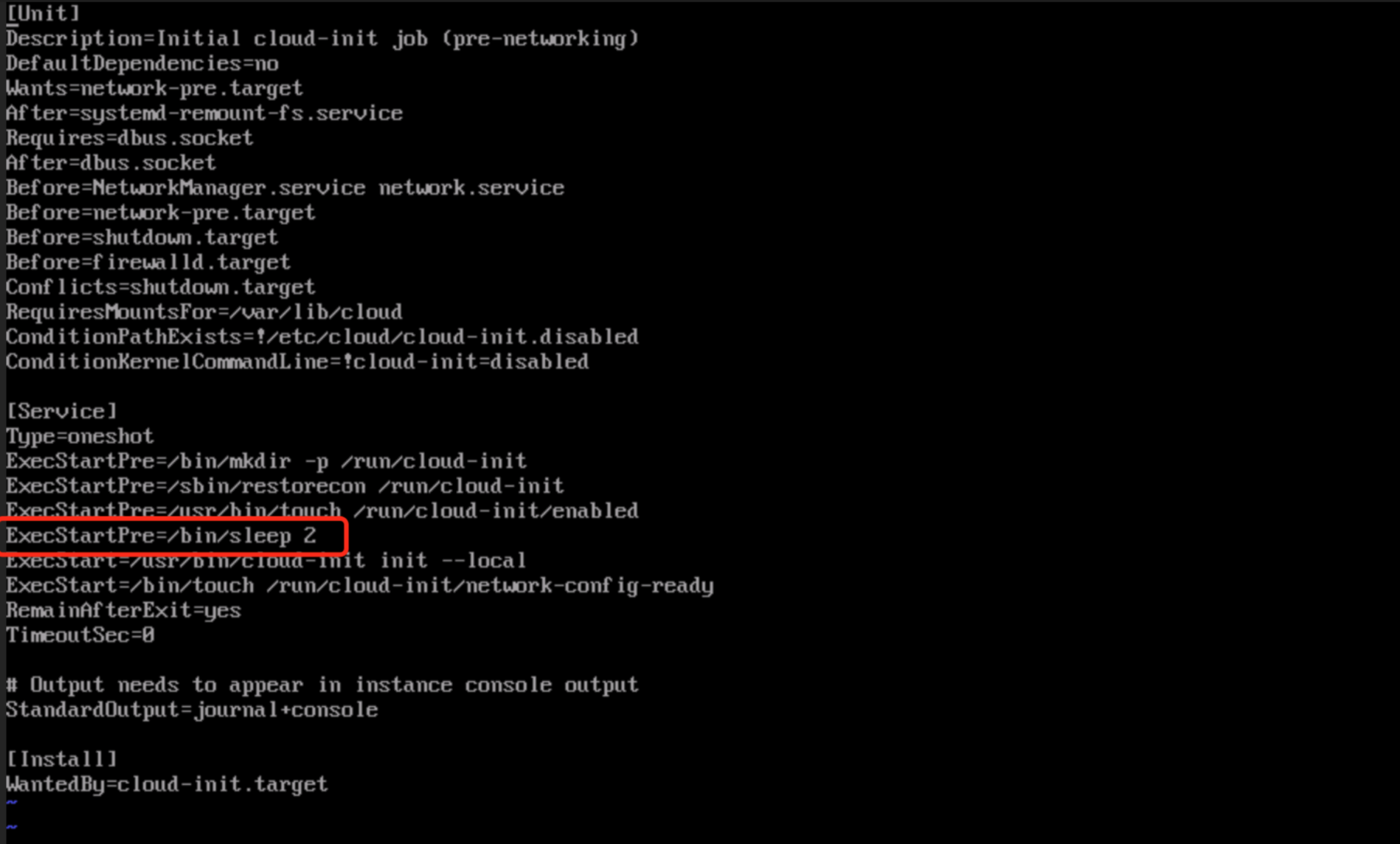 # vim:syntax=yamlWhen a virtual machine boots too fast, especially when the cluster where it resides has Boost mode enabled, cloud-init might be unexpectedly booted before the config drive is mounted, which makes DataSource undetectable. To prevent this issue, you will need to open the configuration file at /usr/lib/systemd/system/cloud-init-local.service and add ExecStartPre=/bin/sleep 2 to its content.