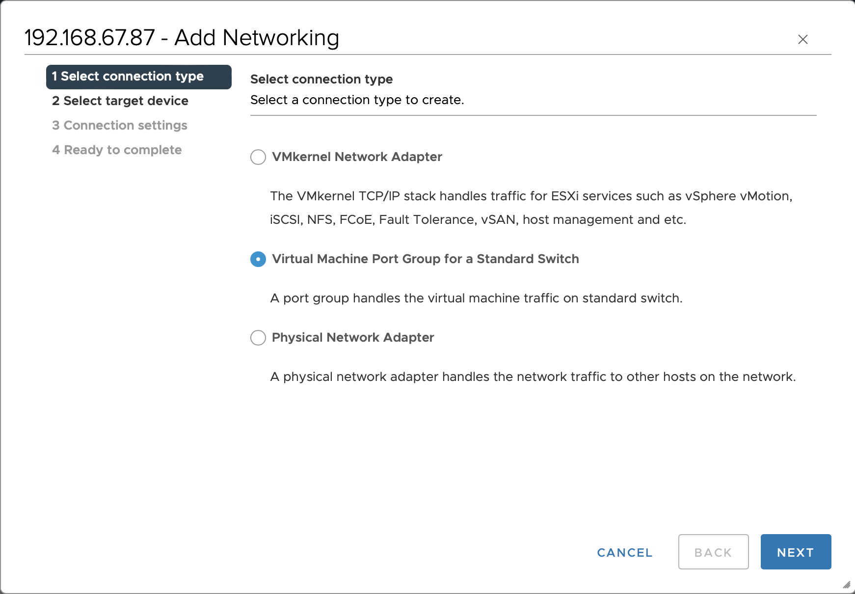 Select an ESXi host and choose Configure > Networking > Virtual switches > ADD NETWORKING. In the pop-up Add Networking dialog box, select Virtual Machine Port Group for a Standard Switch.