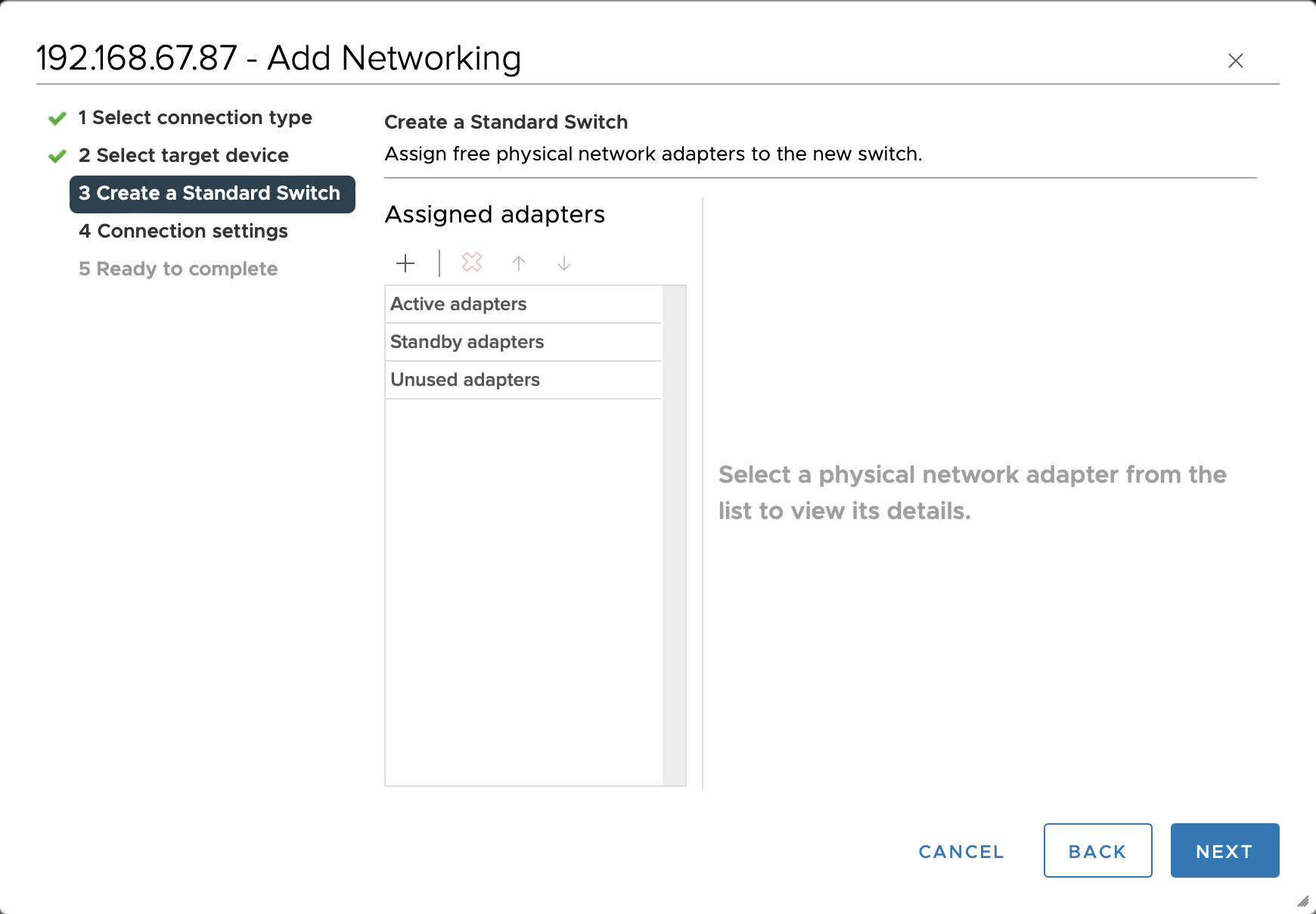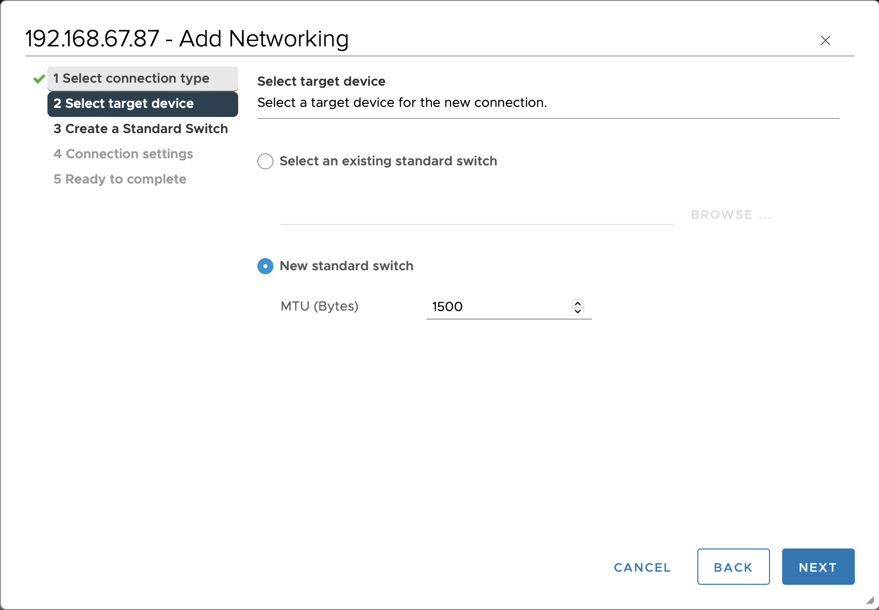 Follow the prompts on the Add Networking page, click NEXT to enter the Select target device page, and select New standard switch.