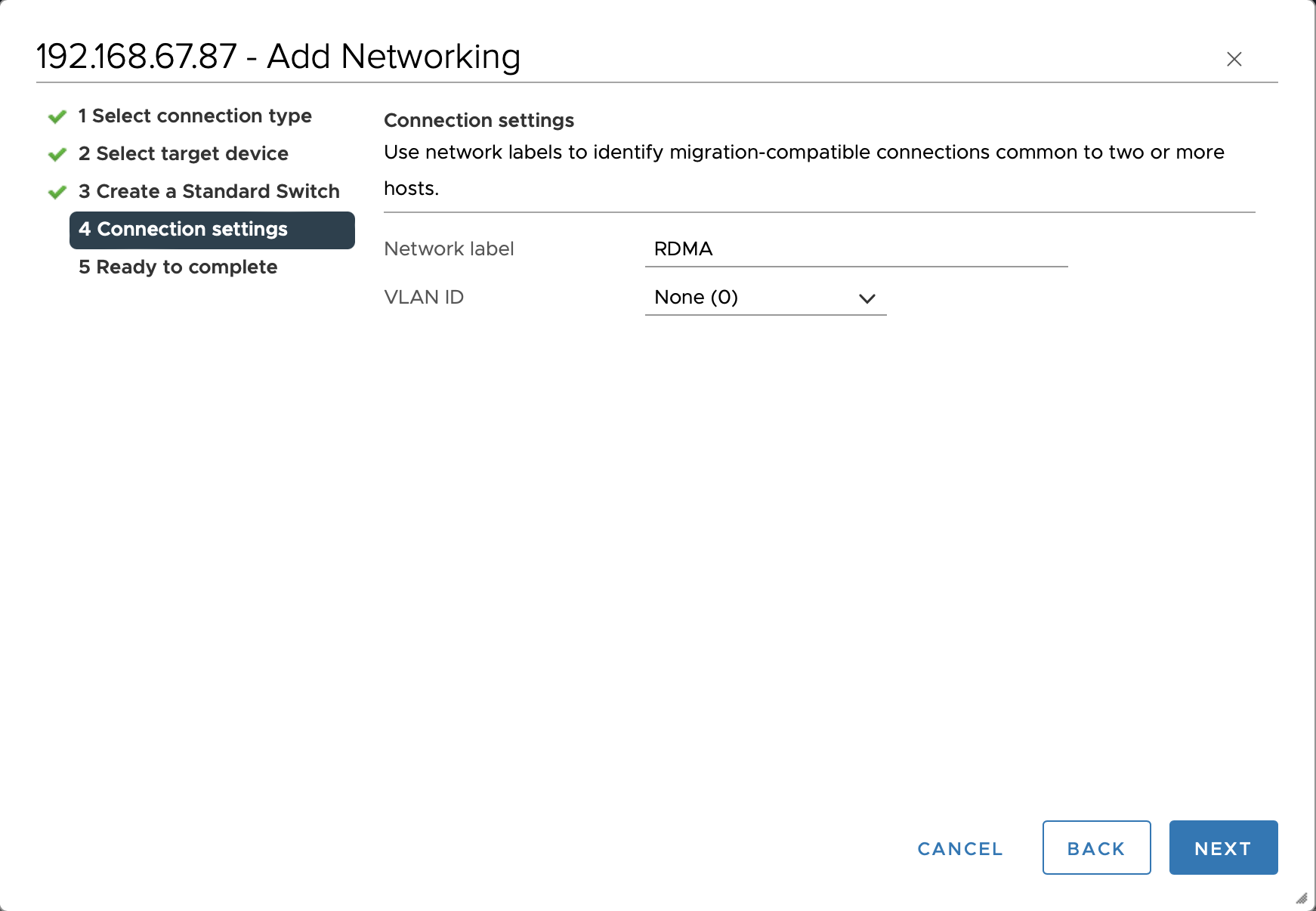 In the Connection settings options, set Network label to RDMA. Click NEXT to continue with the remaining configuration.