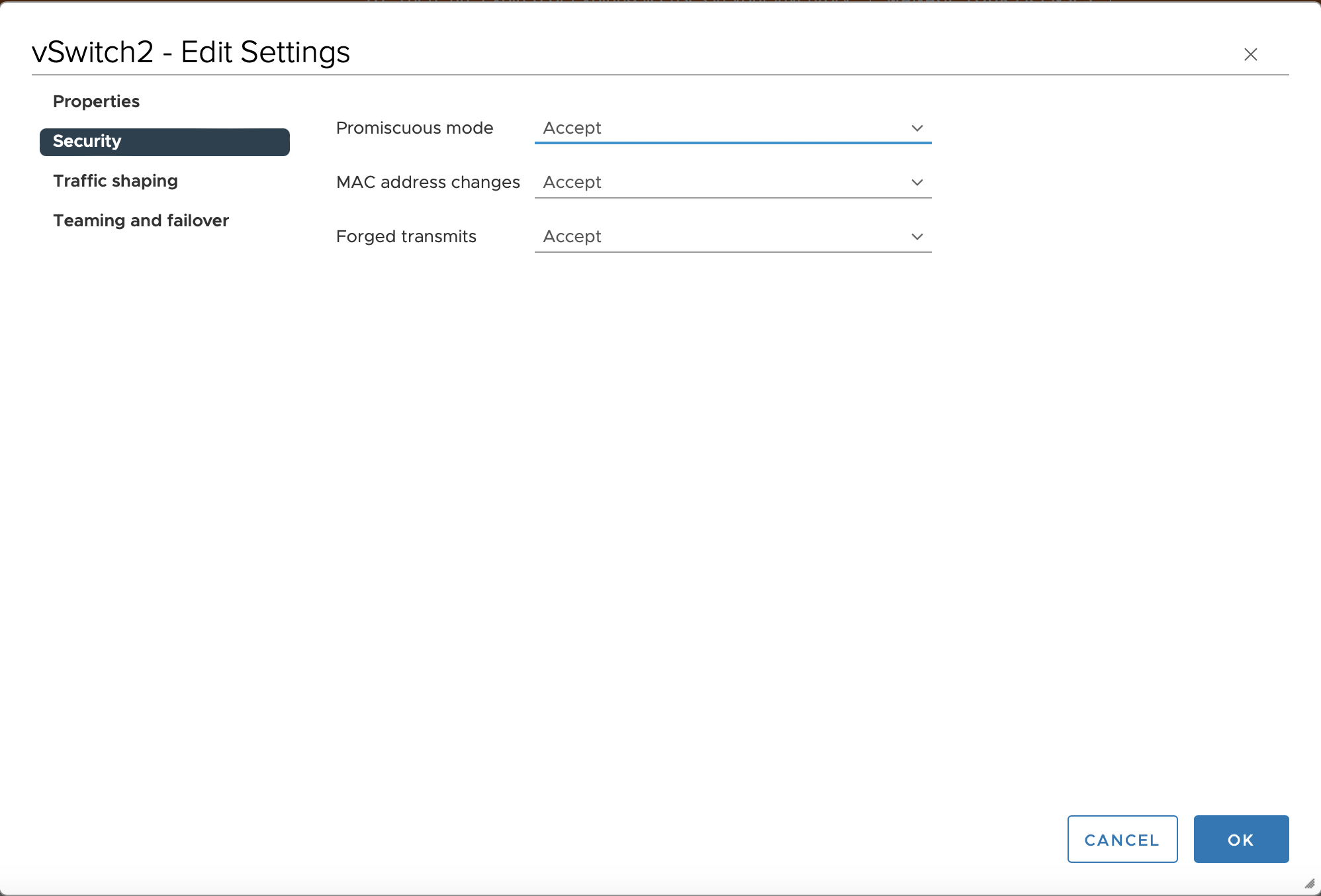 Edit the virtual switch. In the Security options, change the Promiscuous mode from Reject to Accept, and change the Forged transmits from Reject to Accept.