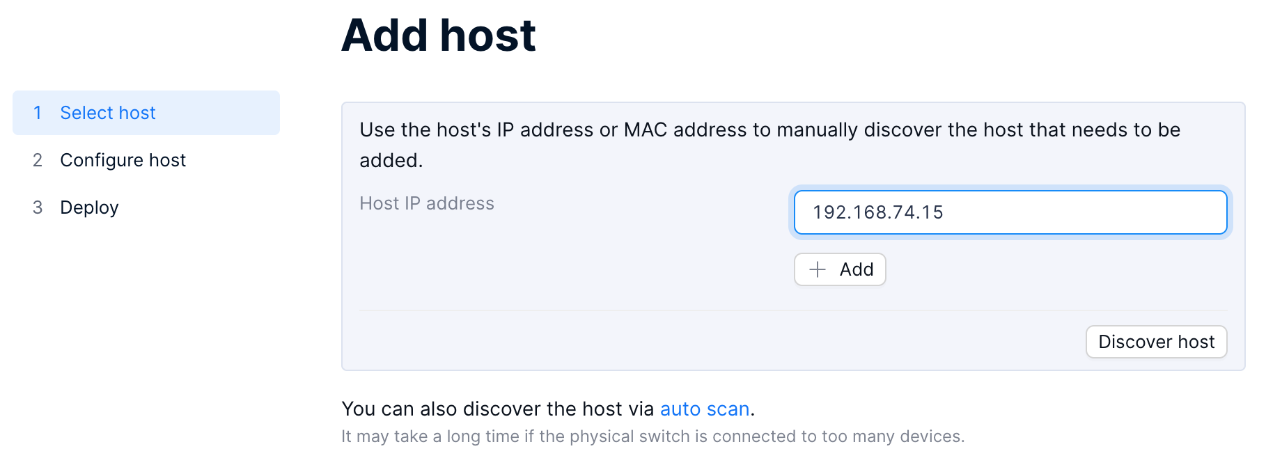 Enter the IP or MAC address of the hosts to be added in the Host IP address input box, click Add to add multiple host addresses, and click the Discover host button to discover hosts.