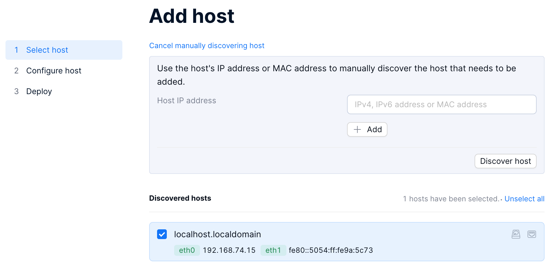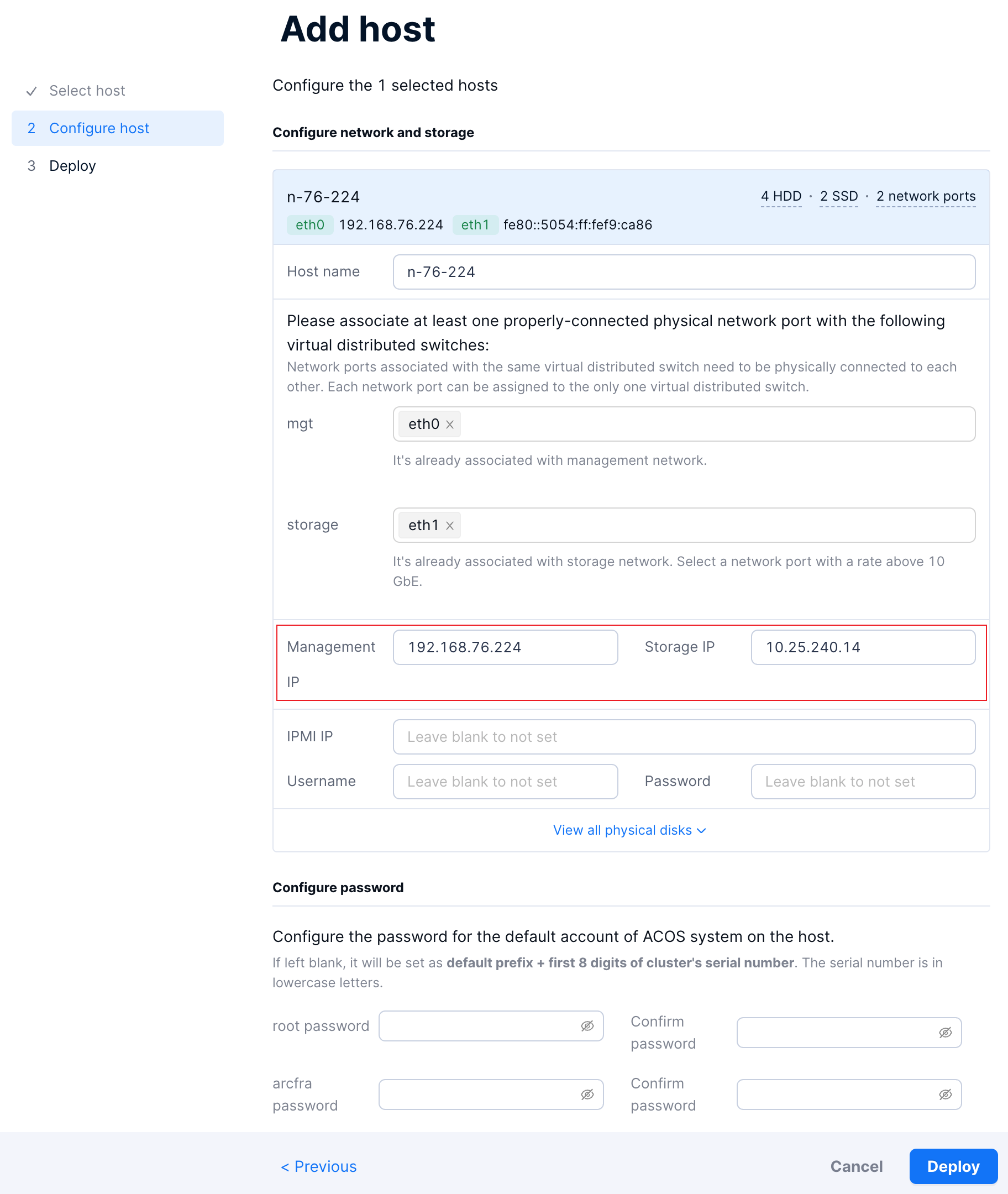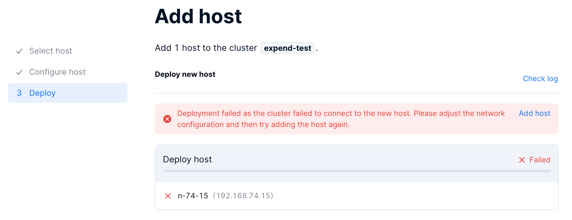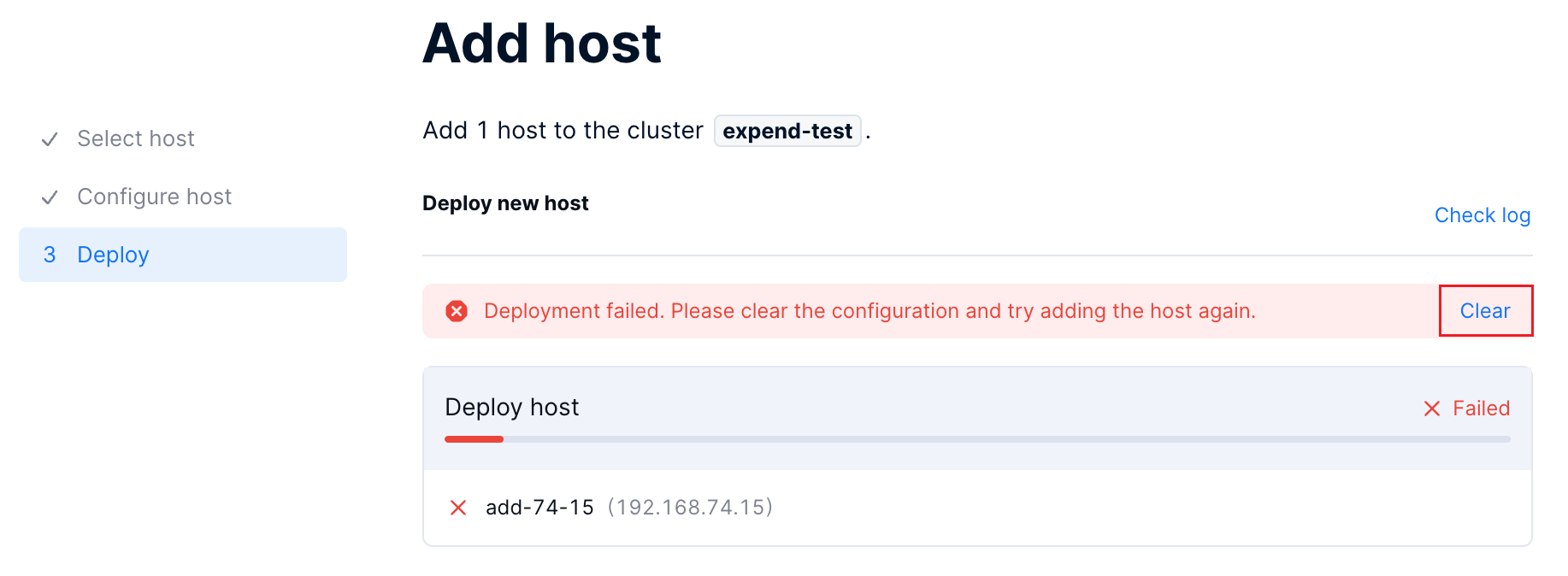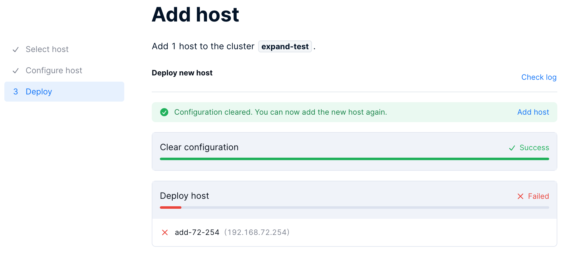 After the clearing is complete, on the Deploy page, click Add host, and add the hosts again from step 1.