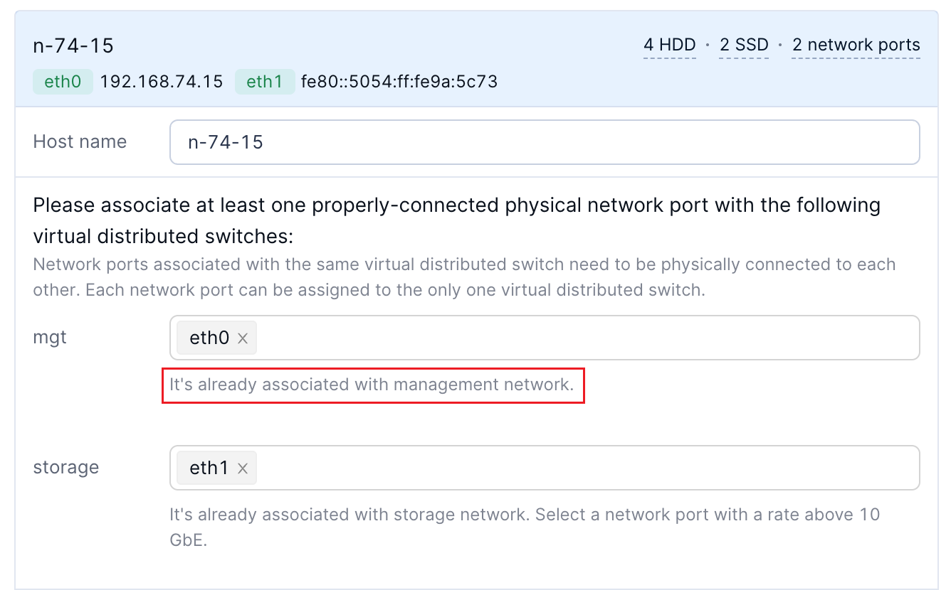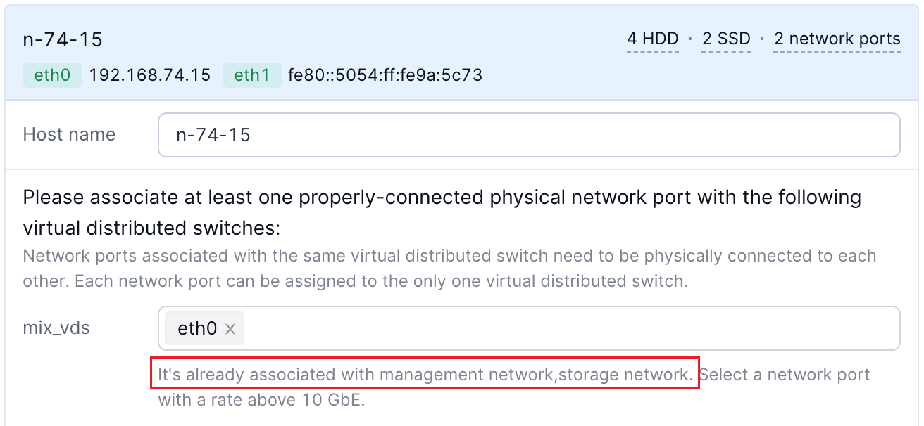 If the virtual distributed switch is associated with networks of multiple usages, as displayed in the following figure, select the physical network port shared by these networks for the nodes to be added.