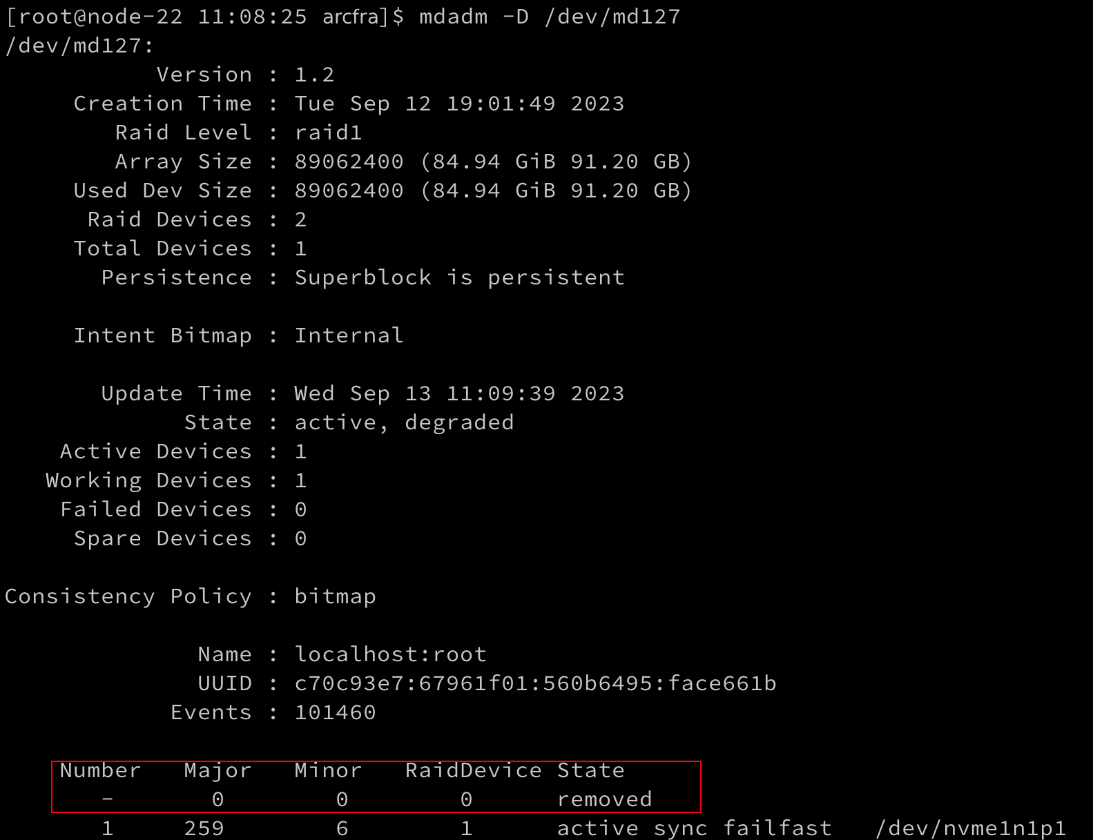 For example, if the NVMe SSD belongs to a RAID array named md127, run mdadm -D /dev/md127 to view the RAID array information, where md127 represents the name of this RAID array. If the output displays the state as removed, the device has been successfully removed.