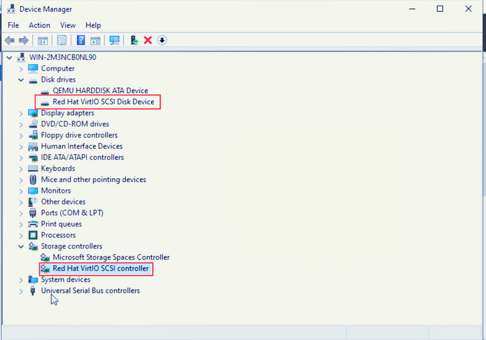 After the installation is complete, in the Device Manager window, if you can find Red Hat VirtIO SCSI Disk Device under Disk drives and Red Hat VirtIO SCSI controller under Storage controllers, it indicates that the VirtIO disk driver has been successfully installed.