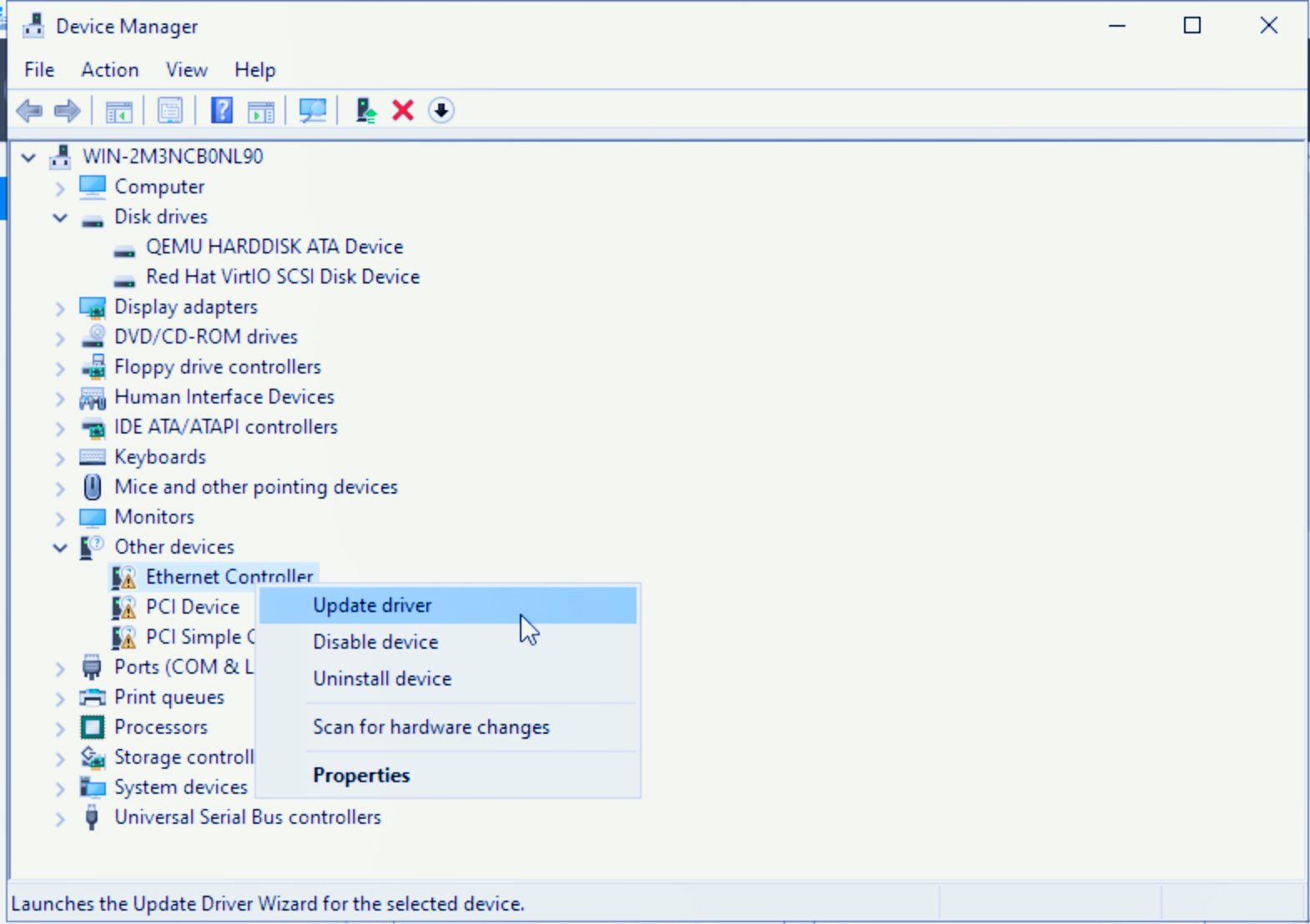 In the Device Manager window, expand Other devices, right-click Ethernet Controller, and select Update driver.