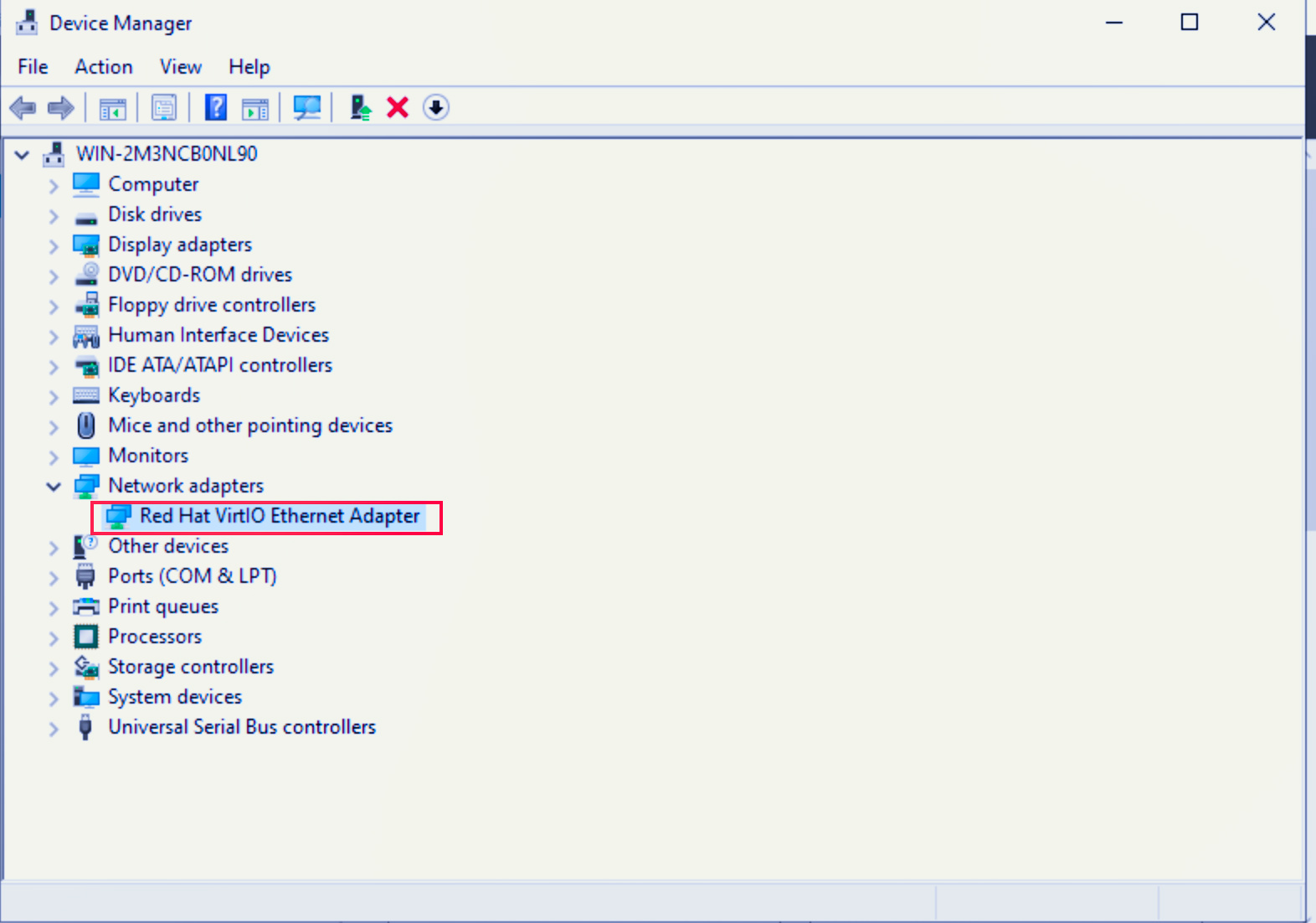 After the installation is complete, if you can find Red Hat VirtIO Ethernet Adapter under Network adapters in the Device Manager window, it indicates that the VirtIO NIC driver has been successfully installed.