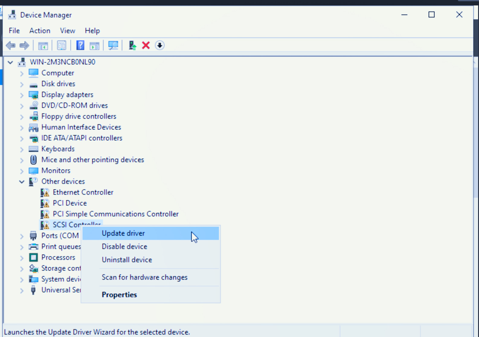 In the Device Manager window, expand Other devices, right-click SCSI Controller, and select Update driver.