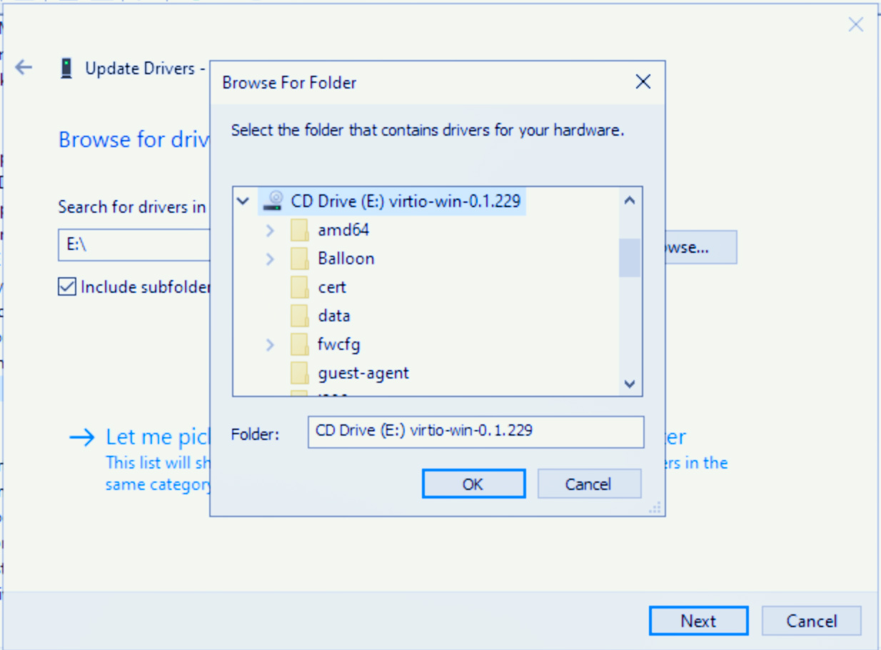 In the pop-up Update Drivers - SCSI Controller dialog box, click Browse my computer for drivers. Select the folder that contains the CD drive for the VirtIO driver and click OK. Then, click Next in the Update Drivers - SCSI Controller dialog box.