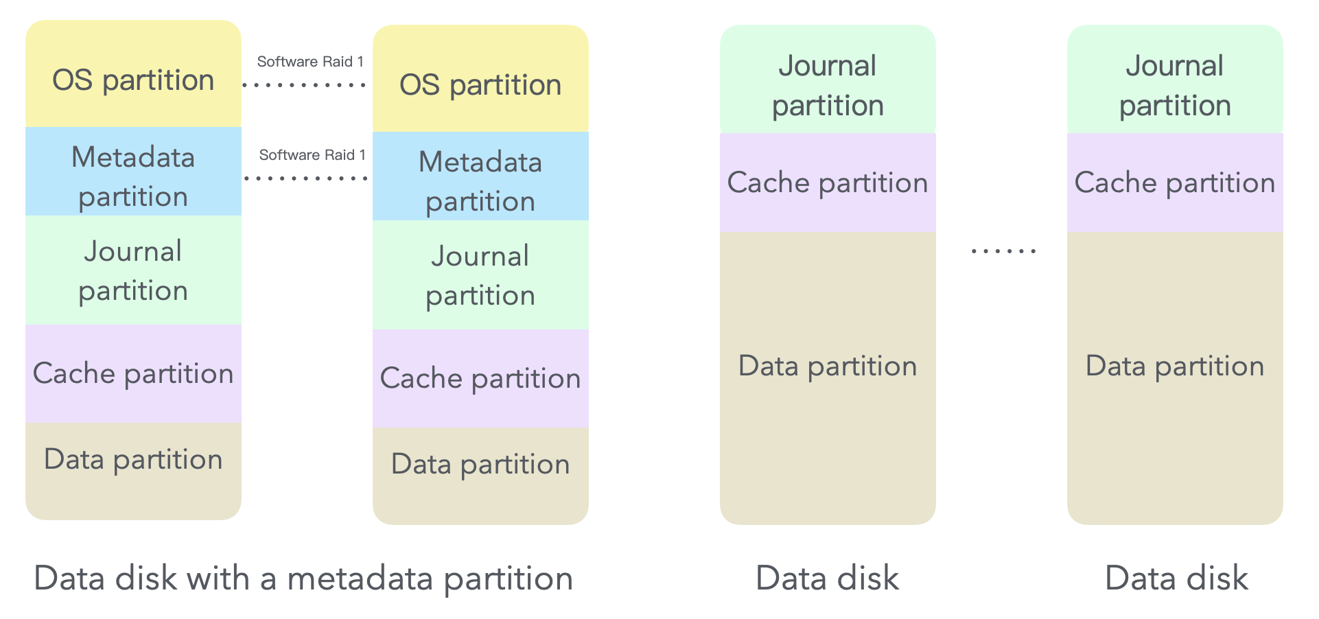 ACOS can be either installed on two physical disks that form software RAID 1, or independently installed on two physical disks that form hardware RAID 1. Under these two deployment methods, only the partitions on the system disks differ, while the partitions on other disks remain the same.