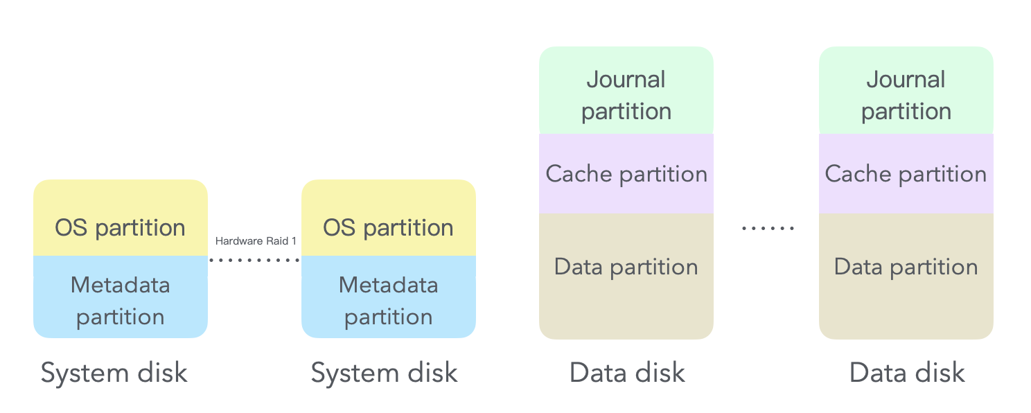ACOS is installed on two independent SSDs, which, together with the storage controller, form a hardware RAID 1 and serve as the system disk. Other physical disks in the node serve as data disks.