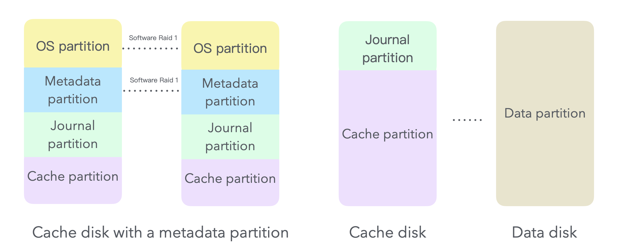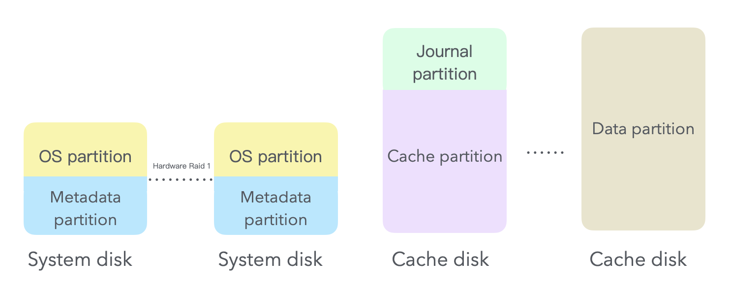 ACOS is installed on two independent SSDs, which, together with the storage controller, form a hardware RAID 1 and serve as the system disk. Other physical disks in the node serve as cache and data disks.